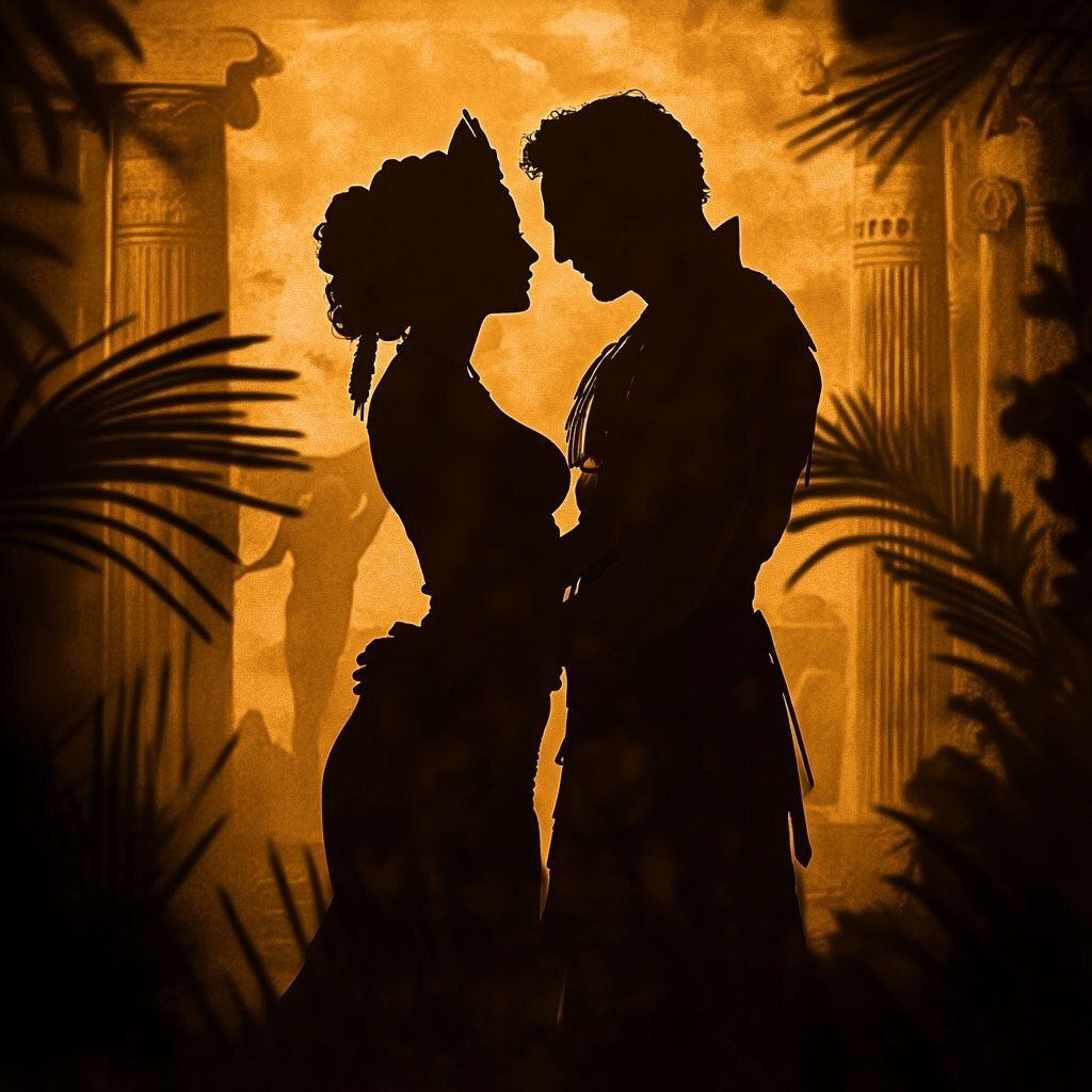 Создано на основе запроса: "A dramatic silhouette of a young, beautiful Cleopatra and a powerful, 50s Roman emperor Julius Caesar