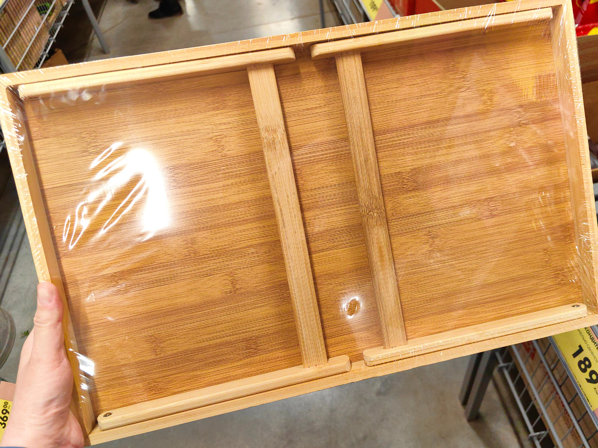 Что еще нового появилось в магазине Чижик? Выставили упаковки, внутри складная конструкция, берут такие для дома. На вид из дерева. Образца нет, но и так понятно, думаю, что деревянные планки выставляются, крепление видно. Поищем этикетку, чтобы понять, как будем новинку использовать дома. Получается, что это поднос, но с подставкой. Те самые складные части с первой фотографии - это ножки. Не заметила фиксатора. Скорее всего крепление тугое, чтобы сами по себе ножки столика не раскладывались. Тогда да, можно использовать дома вместо подноса. А еще вместо столика. Не только для еды, для рукоделия, для рисования, для мелких работ, если нужна опора. Телефон или планшет поставить - да, тоже можно и ноутбук, если небольшой. Судя по этикетке и цвету дерева, бамбук. Для дачи новинка, в рулоне забор. К сетке закреплены искусственные листья. Полотно 1 на 3 метра. Задекорировать стену, заборчик. Для детей хлопковые кофточки, принт - батискаф и дельфин рядом. Для девочек, с бантиком. Ростовк