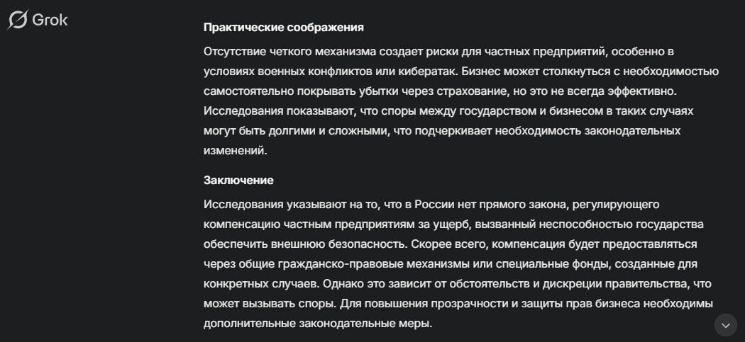 Поручил этот вопрос Grokнуть американской нейросетке. Пока масковская бямка думает, я выдвину свою гипотезу: в действующем российском законодательстве нет механизма компенсации из бюджета физическим и юридическим лицам за ущерб в результате ошибок в действии (бездействии) Вооружённых Сил РФ.