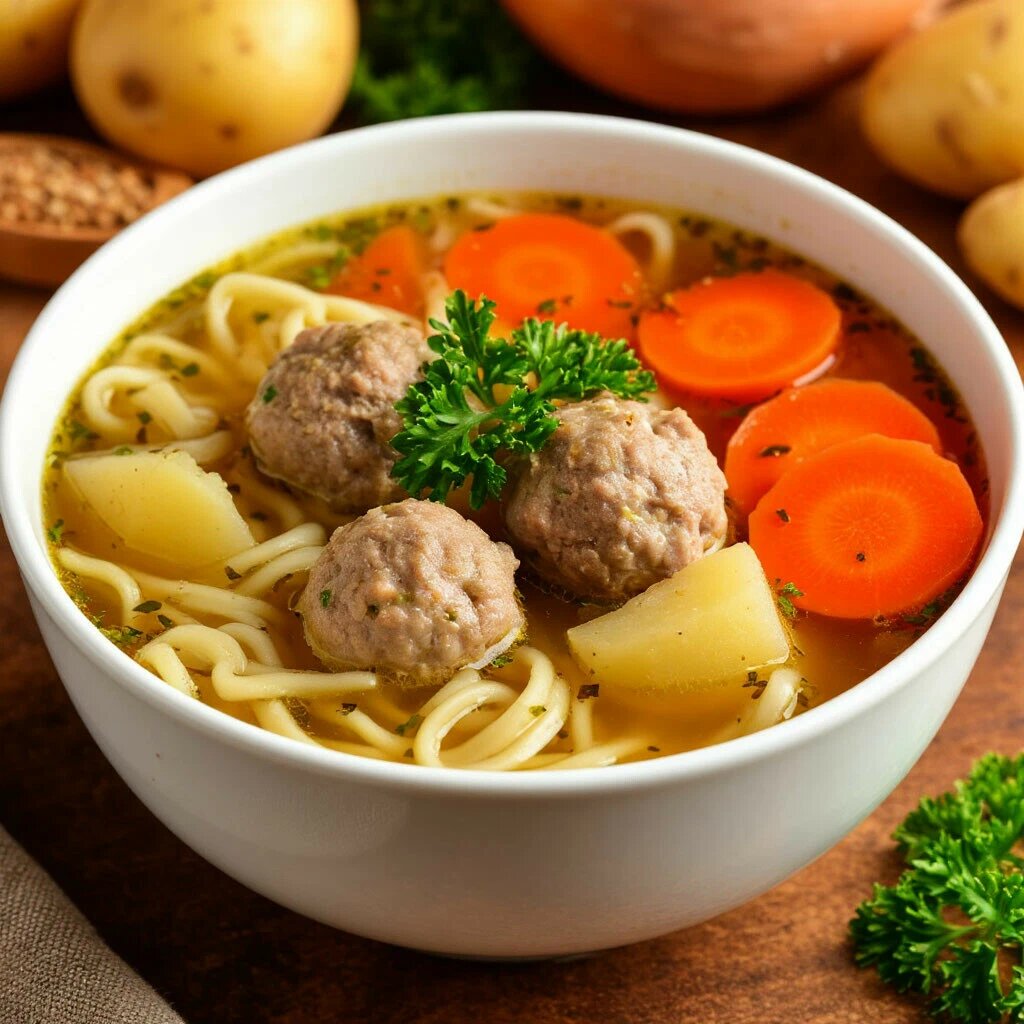 Суп с фрикадельками и вермишелью – это классическое первое блюдо, которое любят и взрослые, и дети. Для приготовления этого наваристого и вкусного супа подготовьте следующие ингредиенты: свиной фарш (230 г), вермишель (100 г), картофель (5 шт.), морковь (0,5 шт.), репчатый лук (1 шт.), растительное масло (60 мл), сушеную петрушку, лавровый лист (1 шт.), черный молотый перец, соль по вкусу и воду (1,7 л). В глубокой кастрюле доведите воду до кипения. Пока вода закипает, очистите картофель и нарежьте его кубиками. Опустите картофель в кипящую воду. Из свиного фарша сформируйте небольшие фрикадельки. Лук и морковь мелко нарежьте. В сковороде разогрейте растительное масло и обжарьте лук с морковью до золотистого цвета. Аккуратно опустите фрикадельки в кипящий бульон с картофелем. Доведите до кипения и снимите образовавшуюся пену. Добавьте в суп обжаренные лук и морковь. Посолите и поперчите суп по вкусу. Добавьте лавровый лист и сушеную петрушку. Варите суп на медленном огне около 15-20 ми