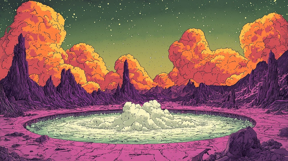 Создано на основе запроса: Mega super giant volcanic crater with white sauce bubbling inside. Expelling clouds of green toxic gas floating in the air. Surrounded by steep mountains. The sky is moss green. In the style of cosmic galaxycore art, with a pixel art aesthetic, soft colors, a cute vector illustration, a purple and red color palette, and a detailed background design of a futuristic building, featuring simple, clean lines, bold shapes, low detail, no shading, flat color, vector graphics, and simple details.