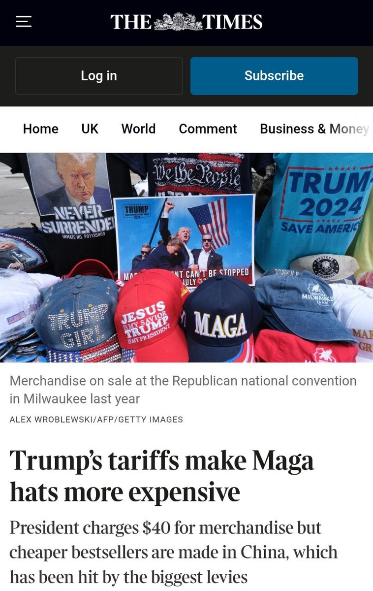 UK MSM really rubbing it in, but Times clarifies that Trump’s tariffs won’t affect his official MAGA hat Just 'cheap copycats' made in China... #Trump #Tariffs