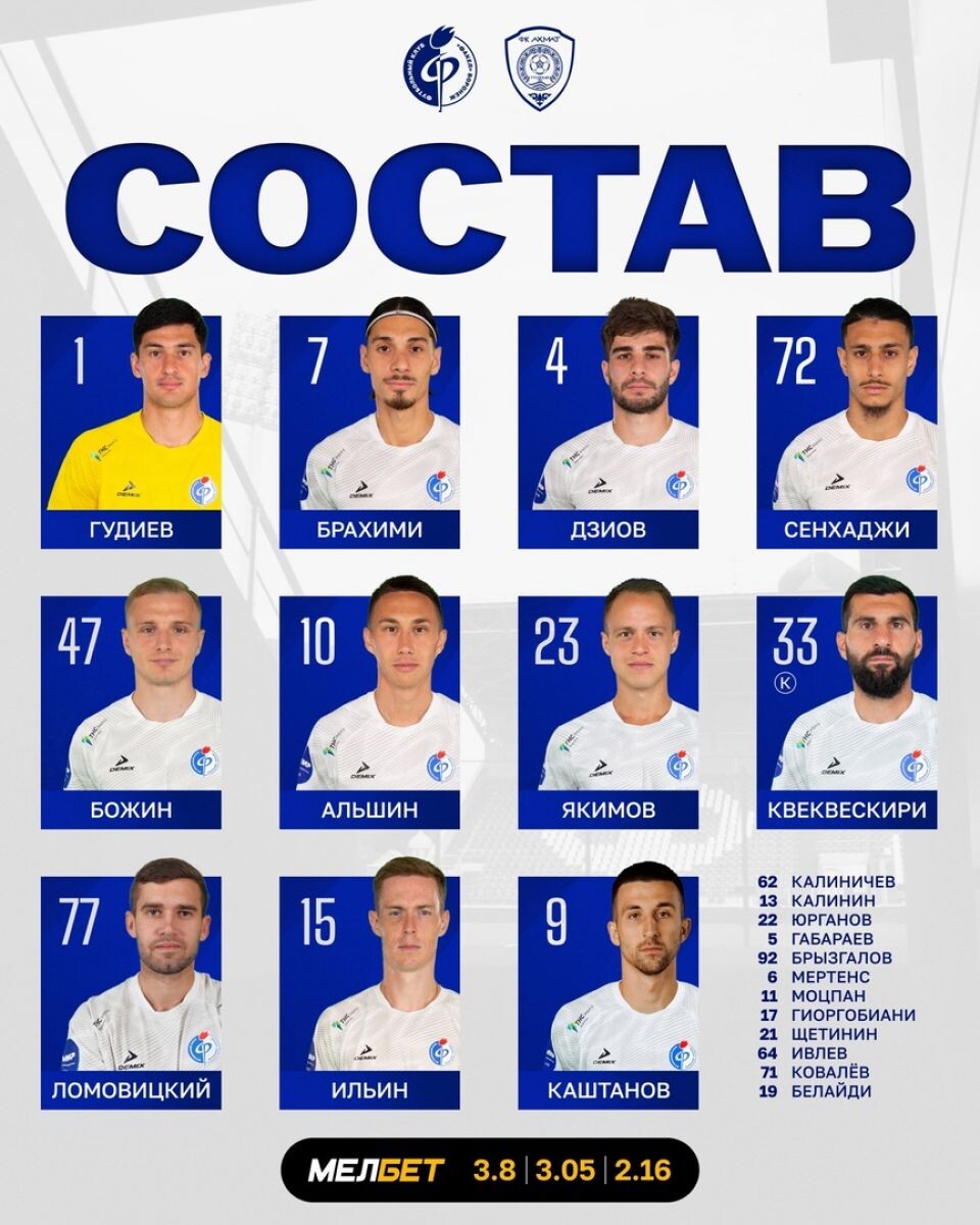 Гудиев, Брахими, Дзиов, Сенхаджи, Божин, Альшин, Якимов, Квеквескири, Ломовицкий, Ильин, Каштанов.