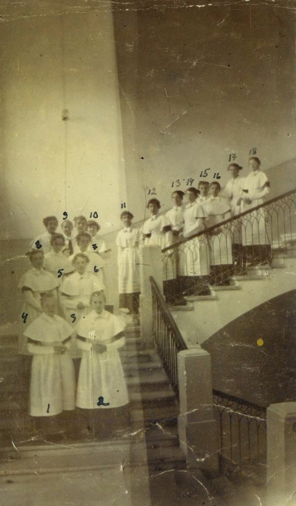 На 1-ой фотографии: Эрне Ольга, [фамилия неразборчива] Ангелина, Миокович Лидия, Бадаева Тамара, Попова Валентина, Яковлева Валентина, Агеева Зоя, Федорова Вера, Алферова Вера, Загорская Зинаида, Умыруко-Запольская Надежда, Василенко-Иваницкая Лидия, М[?]икевич Надежда, Сопина Елена, Ивановская Евгения, Бельченко Варвара