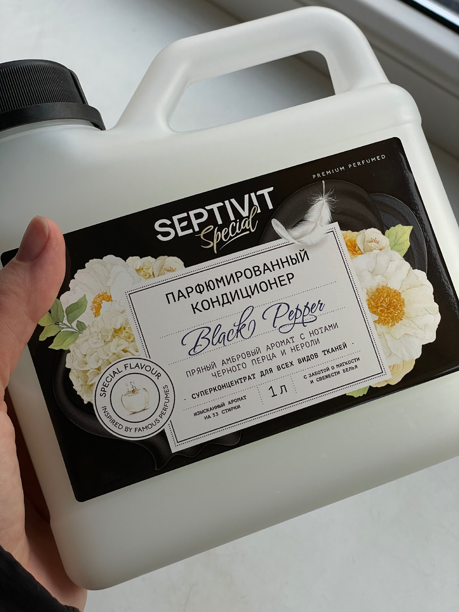 Аромат, который остаётся с тобой Обычно кондиционеры для белья обещают "тонкий аромат", который на деле либо исчезает сразу после сушки, либо напоминает классическую "бытовую свежесть". Но с этим кондиционером от *SEPTIVIT Special* всё оказалось иначе. У него настоящий парфюмерный запах — не химозный, не мыльный, а именно утончённый и сложный. В аромате ощущаются ноты чёрного перца и нероли, и звучат они мягко, не кричаще. Что приятно — запах действительно остаётся на ткани. Не так, чтобы душил, но достаточно, чтобы поймать шлейф, когда надеваешь одежду или открываешь шкаф. Это как продолжение любимого парфюма — теперь он не только на коже, но и в самой одежде, в постельном белье, в повседневных мелочах. Такая деталь, которая делает ощущение ухода за собой чуть глубже и чувственнее. Парфюм, вплетённый в ткань — звучит поэтично, но именно так и ощущается. И самое интересное — этот аромат не конфликтует с духами, которые носишь, а скорее дополняет их, создавая более цельное впечатле