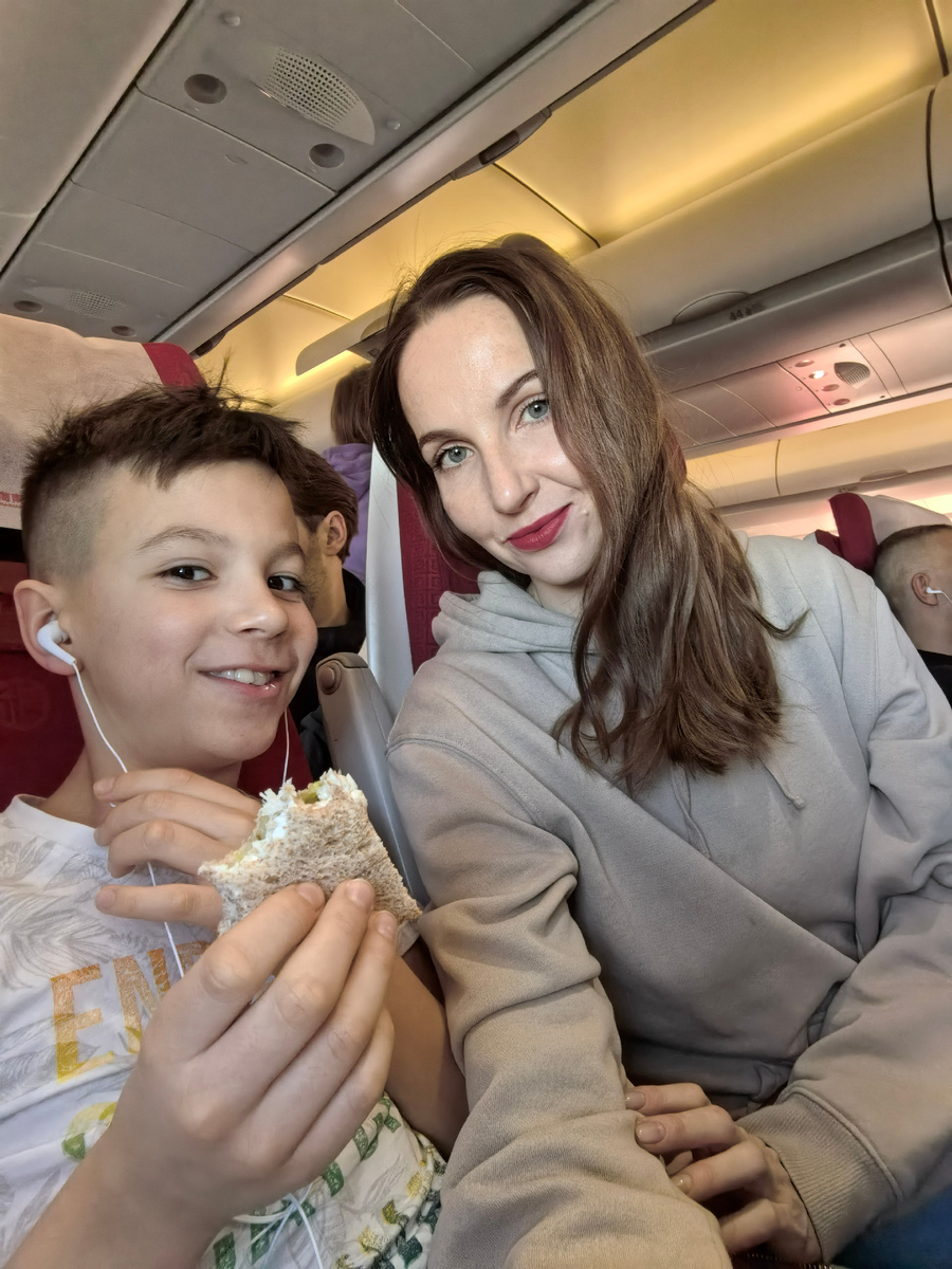 Сын доедает легендарный сэндвич, все путешественники о нем пишут - столько начинки в самолетных бутербродах я еще не встречала, правда)
