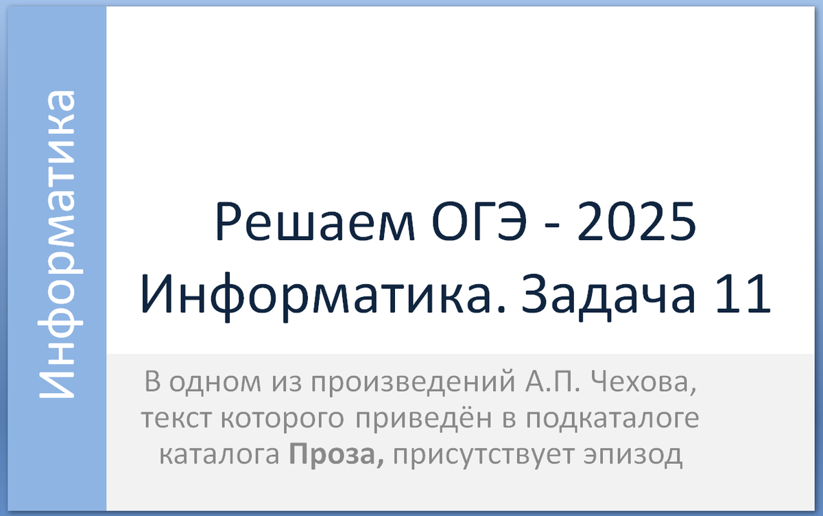 ОГЭ по информатике? Это просто! Готовьтесь к экзамену вместе с нами. Рассмотрим решение задачи номер 11 на поиск информации в файлах. Условие задачи: В одном из произведений А.П. Чехова, текст которого приведён в подкаталоге каталога Проза, присутствует эпизод, в котором щенок, «взятый приучаться», услышал выстрел и поджал хвост. С помощью поисковых средств операционной системы и текстового редактора выясните кличку этого щенка. Требования к предметным результатам освоения основной образовательной программы: Поиск информации в файлах и каталогах компьютера Примерное время выполнения задания (мин.) - 6 Для выполнения задания нам понадобится папка с дополнительными материалами, которую можно скачать с сайта ФИПИ (раздел: Демоверсии, спецификации, кодификаторы). Для выполнения задачи номер 11 потребуется скачанная папка (каталог) "Проза", содержащая, в том числе, и подкаталог "Чехов". В папке "Чехов" содержится несколько произведений Антона Павловича Чехова в разных форматах файло