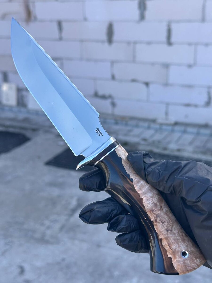 Разделочный нож Алтай из отечественной нержавеющей стали 95х18 (твёрдость 58 HRC) с рукоятью из композита карельской берёзы и акрила. На клинке чуть вогнутая линза от середины спусков, фальшлезвие, упор под большой палец, финишная полировка в зеркало, бритвенная заточка режущей кромки. Ножны в комплекте. Цена по 30 апреля 7072 руб. Обычная цена 8840 руб. Можем изготовить формованные ножны из кожи растительного дубления (+ 8000 руб.) Для заказа писать на @Nazarklinokbot или по тел +79101343831, WhatsApp