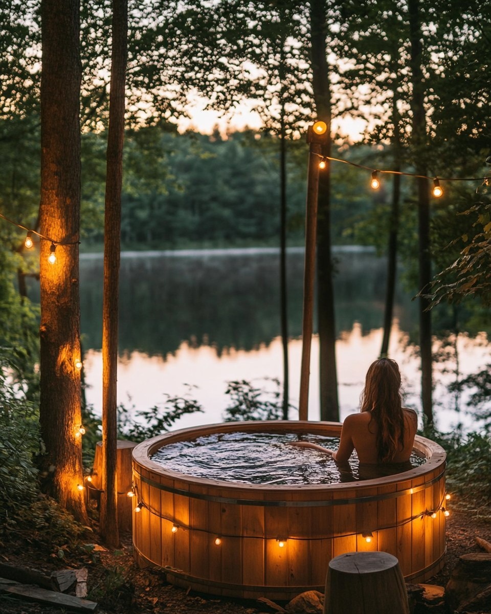 Создано на основе запроса: A wooden hot tub nestled in the woods, with a woman sitting inside. The serene setting includes a lake and forest, with string lights surrounding the tub and a sunset in the background.