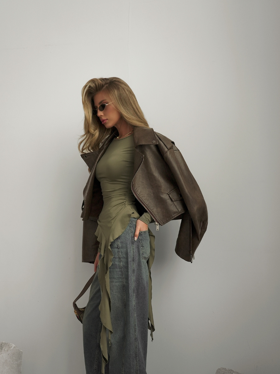 - Косуха из эко-кожи с эффектом состаренности (Артикул: 340681256) – это наша находка для тех, кто любит бунтарский стиль, но заботится об окружающей среде. Эта косуха выглядит как настоящая винтажная вещь – с потертостями и складками, которые придают ей особый шарм. А еще она очень приятная на ощупь!