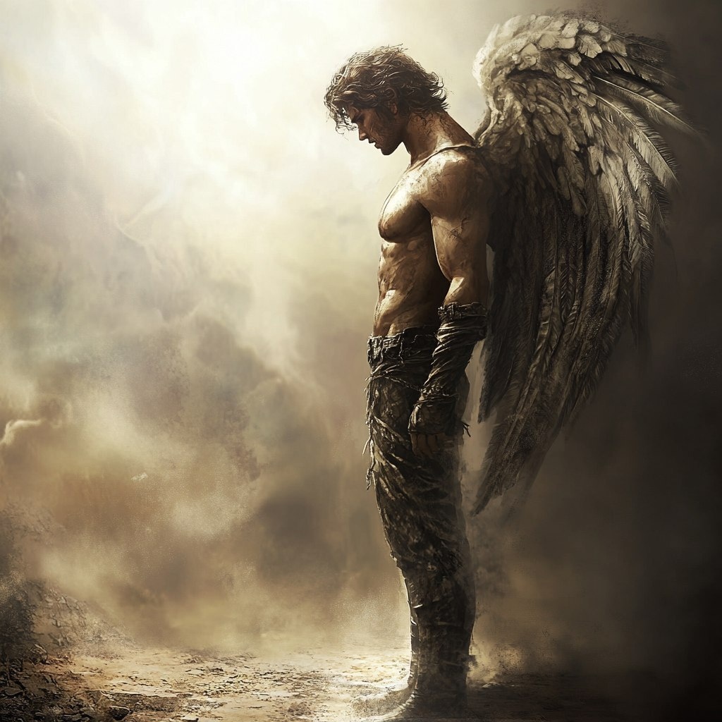 Создано на основе запроса: image of the strong angel standing strong on the ground with wings tucked looking into the distance.
