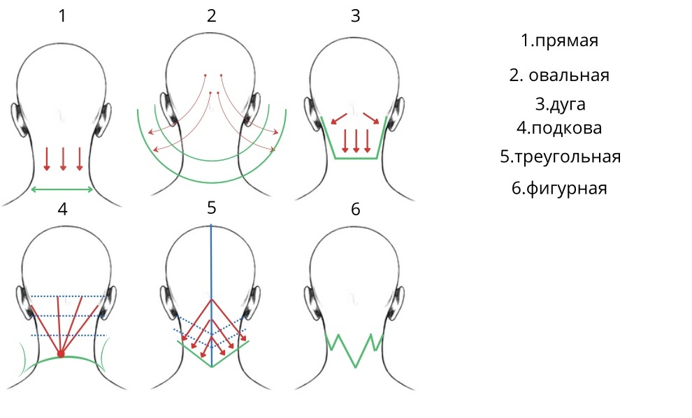 Вид окантовки выбирают, учитывая: — форму будущей стрижки; — особенности лица, шеи человека; — наличие изъянов, которые нужно скрыть; — естественное направление и особенности роста волос; — пожелание клиента. Окантовка может выглядеть по разному: — плотный или облегченный филированием срез — сведенной на нет Виды окантовки затылка. Окантовка затылка по форме может быть: прямая - Длина окантовки разная. Прядь или всю массу волос в зависимости от избранного способа отчесывают вниз и срезают по прямой линии от середины в обе стороны : сначала налево, потом направо. овальная - применяется в зависимости от длины. Волосы разделяют дугообразными проборами, расчесывают вниз, оттягивают вперед к лицу и срезают волосы внутренним срезом. дуга - Длина окантовки может доходить до воротника футболки. Волосы расчесывают вниз, срезают по прямой линии. Потом волосы зачесывают вперед к лицу, срезают под углом и закругляют углы. Угол наклона среза зависит от размера шеи и будет тем больше, чем боле