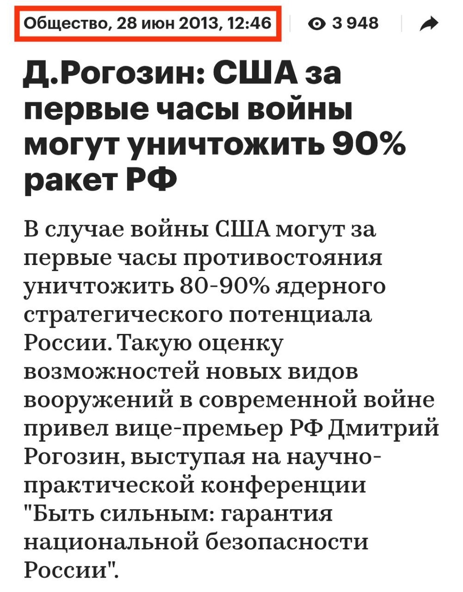 🗣Рогозин: Россия проиграет войну США за 6 часов