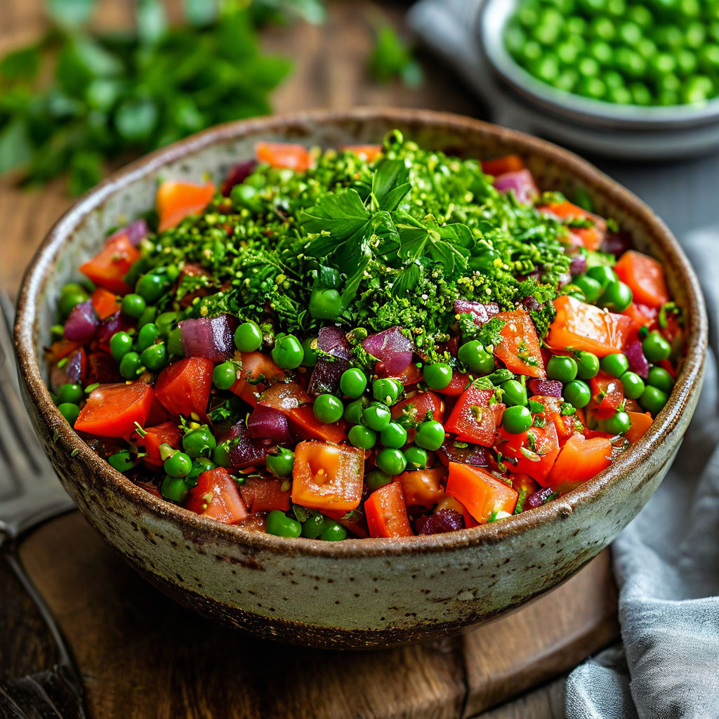 Винегрет классический с горошком – это простой, полезный и вкусный салат, который знаком каждому с детства. Для приготовления этого салата подготовьте следующие ингредиенты: свеклу (400 г), картофель (250-300 г), морковь (150 г), нерафинированное подсолнечное или оливковое масло (2 ст.л.), соленые огурцы (200 г), салатный лук (0.5–1 шт. по вкусу), квашеную капусту (100 г по желанию), консервированный горошек (250-400 г по вкусу); для заправки – растительное масло (2 ст.л.), винный уксус или сок лимона (1 ст.л.), горчицу (1 ч.л.), соль, молотый черный перец по вкусу, щепотку сахара и зеленый лук (1-2 стебля по желанию). Свеклу, картофель и морковь отварите до готовности в кожуре, остудите, очистите и нарежьте кубиками. Соленые огурцы нарежьте кубиками. Салатный лук мелко нарежьте. Квашеную капусту, если используете, отожмите от лишнего рассола и мелко нарежьте. В большой миске соедините нарезанные свеклу, картофель, морковь, соленые огурцы, салатный лук и квашеную капусту. Добавьте конс