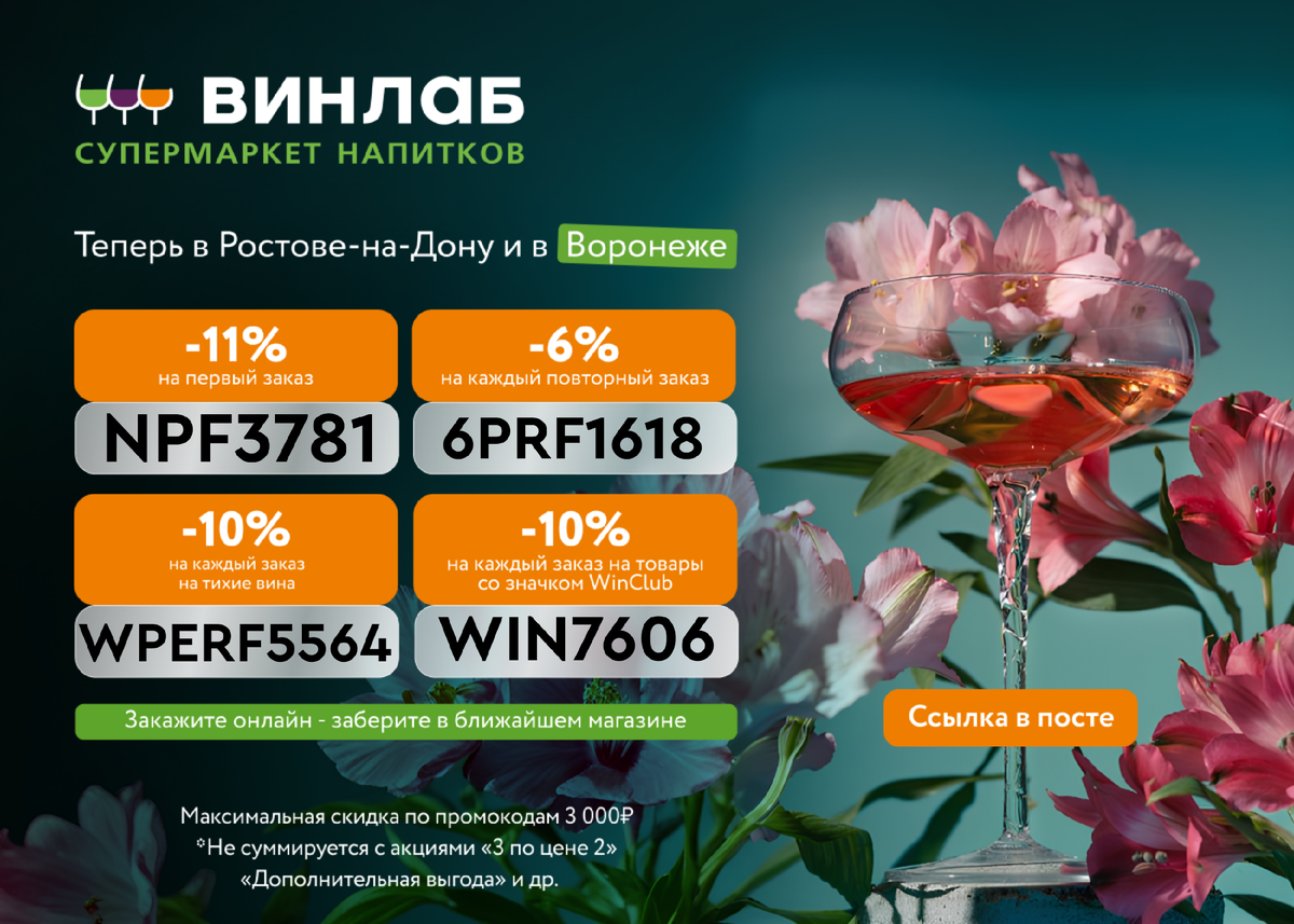 Максимальная сумма скидки – 3000 ₽. Промокоды действуют в интернет-магазине с последующим самовывозом https://winelab.prfl.me/6238cc608d70de4bf05c082d/f7ztuj