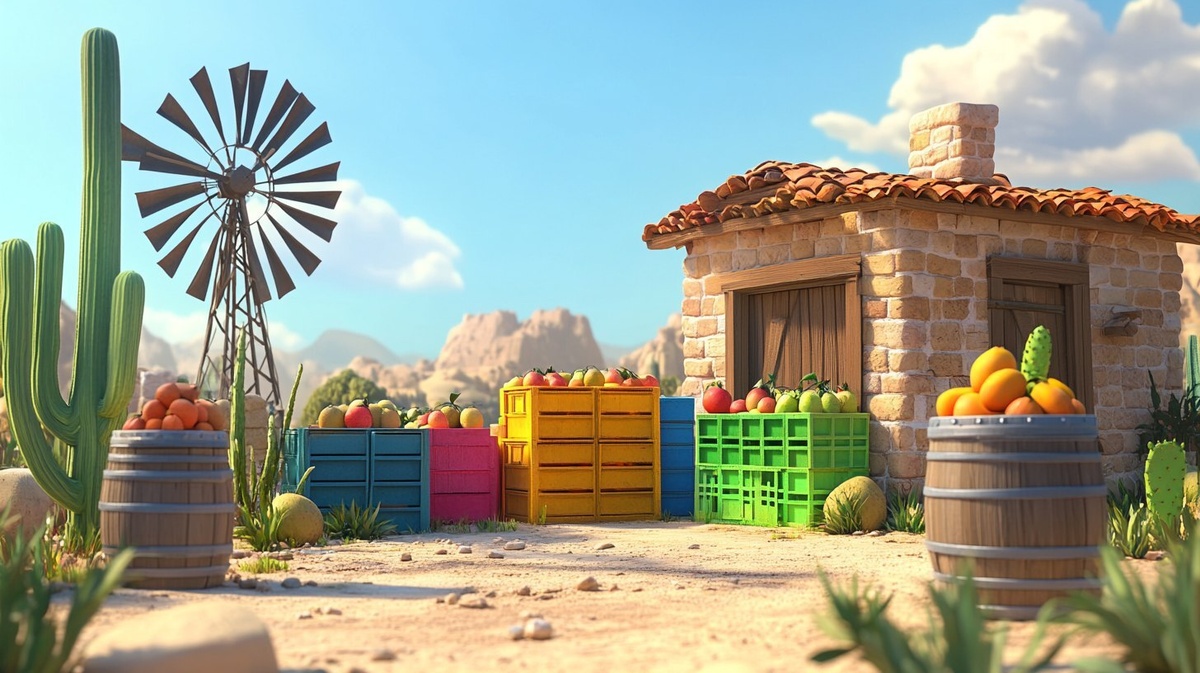 Создано на основе запроса: Desert farm with windmill, 2 barrels of fruit, cactus patch, colorful crates stacked neatly, sunny, 3D animation