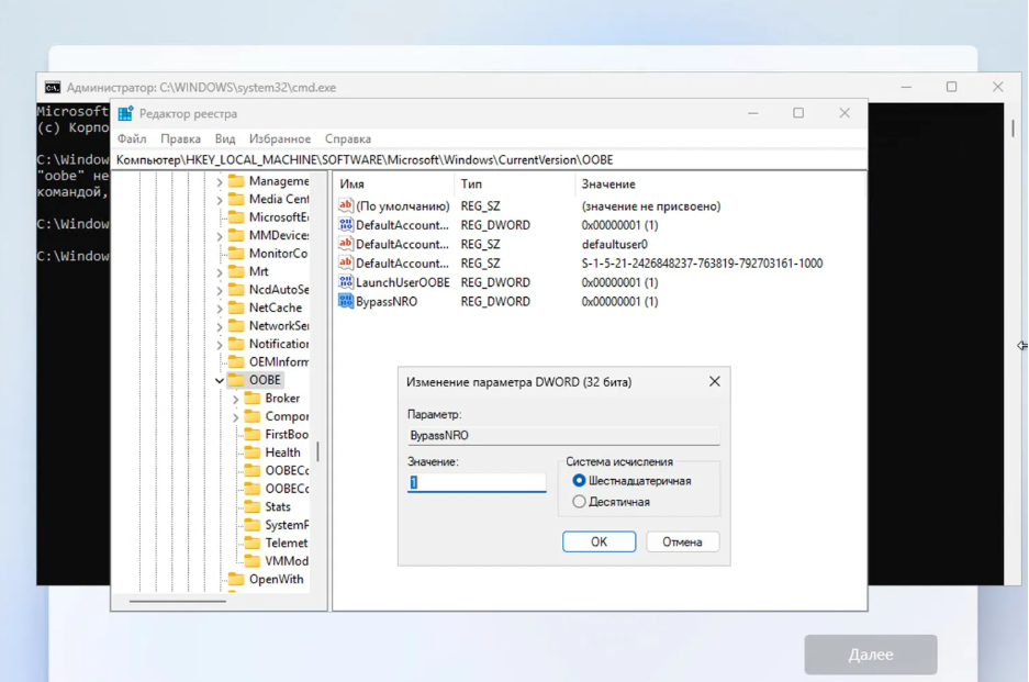 Microsoft Windows 11 без Интернета — отключена команда OOBE\BYPASSNRO, но обход всё ещё возможен!!! Microsoft закрыла известную лазейку, которая позволяла устанавливать Windows 11 без интернета и учётной записи Microsoft с помощью команды OOBE\BYPASSNRO. Рассказываю, как снова обойти это ограничение через реестр системы. - На экране Давайте подключим вас к сети во время установки Windows 11 нажмите комбинацию клавиш Shift+F10, чтобы открыть командную строку. Введите regedit и нажмите Enter. - Перейдите в реестре по пути: Computer\HKEY_LOCAL_MACHINE\SOFTWARE\Microsoft\Windows\CurrentVersion\OOBE - Создайте новый параметр, выбрав Правка > Создать > Параметр DWORD (32-бита), и назовите его BypassNRO. - Откройте созданный параметр и присвойте ему значение 1. Перезагрузите компьютер. После выбора языка и раскладки клавиатуры вы должны увидеть новую опцию У меня нет Интернета. - Теперь вы сможете завершить установку Windows 11 без интернета и без учётной записи Microsoft. Вы также можете сра