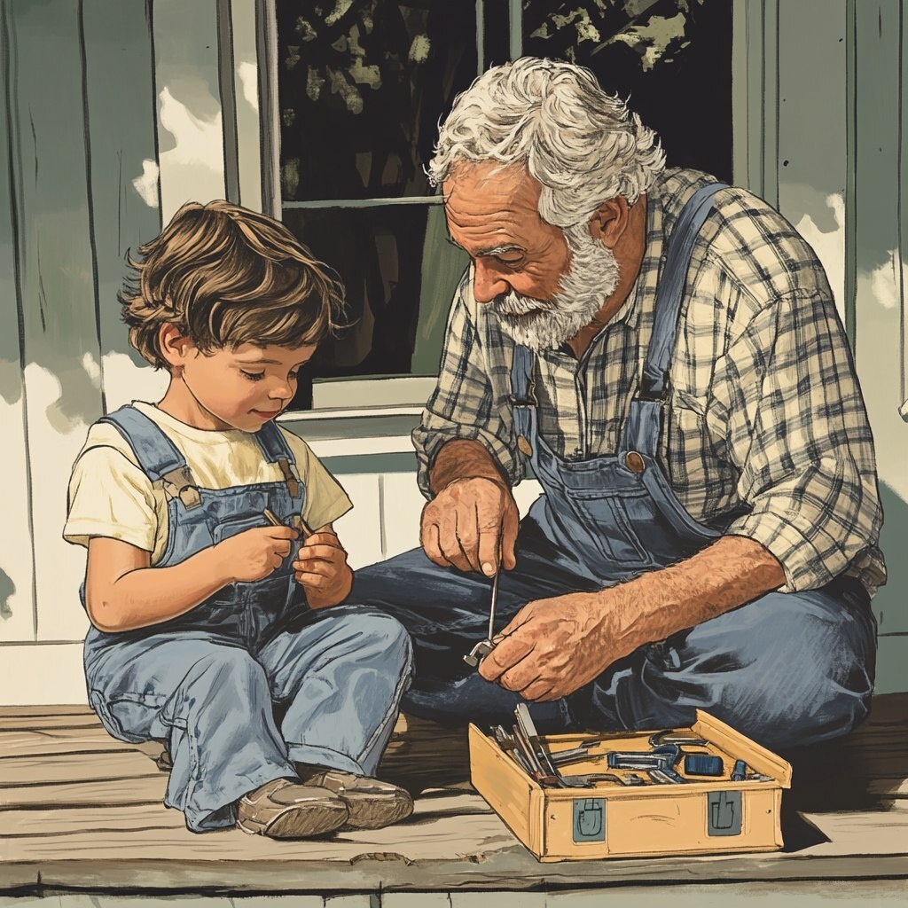 Создано на основе запроса: A heartwarming illustration of Sammy, a six-year-old boy with wavy brown hair, blue eyes, wearing blue jean bib overalls and a light plaid shirt, sitting beside Grandpa on a rustic wooden porch. Grandpa, wearing a gray plaid shirt, with gray hair, a gray beard, and mustache, watches warmly as Sammy holds a screwdriver, turning it curiously in his hands. The open toolbox beside them reveals neatly arranged tools. Gentle golden sunlight bathes the scene, casting soft shadows and creating a peaceful atmosphere. The art style is whimsical with soft hand-drawn details and painterly textures, ensuring an uplifting visual." --- Автоперевод: Душевная иллюстрация Сэмми, шестилетнего мальчика с волнистыми коричневыми волосами, голубыми глазами, в комбинезоне голубого джинса и легкой клетчатой рубашки, сидящей рядом с дедушкой на деревенском деревянном крыльце. Хорошо выглядит? 🤔 https://dzen.ru/id/65c0c65c86e4f837c27b24d7 #ИИ #AI #нейросеть #midjourney #art