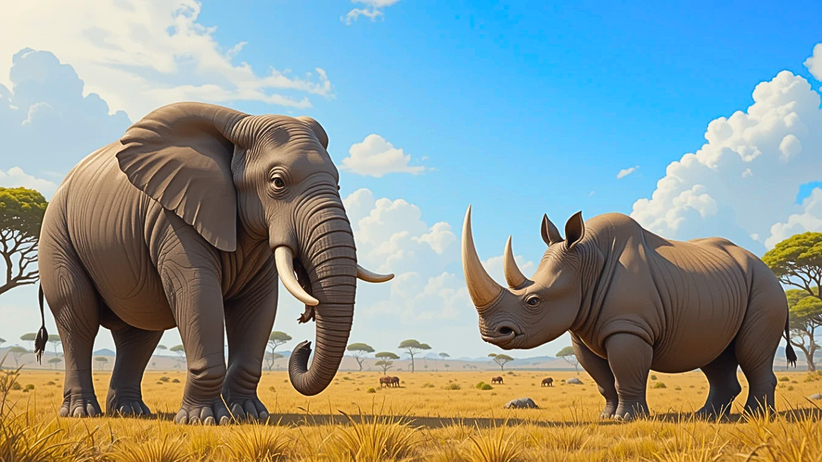 В жаркой саванне, где солнце будто специально так сильно палило, что даже трава засыхала, а вода в лужах пересыхала, жили два громадных приятеля: слон по имени Рамбур и носорог Грутон.