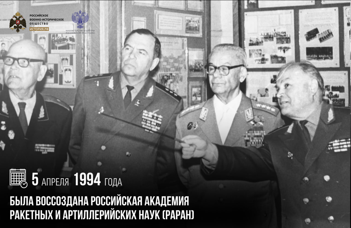 5 апреля 1994 года была воссоздана Российская академия ракетных и артиллерийских наук (РАРАН) Свою историю РАРАН ведет от Академии артиллерийских наук, которая появилась еще в 1946 году. В ней занимались разработкой теории вооружения и боевого применения артиллерии. Просуществовав всего семь лет, в 1953 году Академия была упразднена. Появиться вновь ей удалось лишь через 41 год — 5 апреля 1994 года. По инициативе Минобороны РФ и Госкомитета РФ по оборонным отраслям промышленности Президент России Борис Ельцин подписал указ «О воссоздании Российской академии ракетных и артиллерийских наук». #памятныедаты_ИсторияРФ