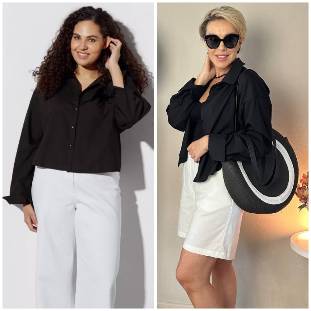 Здравствуйте, дорогие читатели! Меня зовут Ирина, я - стилист, и на этом канале показываю одежду и аксессуары с Wildberries такими, как они есть, то есть, из серии "ожидание/реальность". Мои параметры: рост 169 см, вес 67 кг, 94-74-100 ✅Основной канал: Стильно - не значит дорого! Ставьте лайк в поддержку канала, и давайте смотреть на мою сегодняшнюю покупку. Черная рубашка прямого кроя, отличающаяся от классической базы своей длиной: модель укороченная. Выполнена из плотной ткани, которая за счет наличия в составе полиэстера почти не мнется и хорошо держит форму. Рубашка очень лаконичная, поэтому подойдет для разных случаев: от работы до отпуска на море. Есть также в белом цвете. У рубашки нет карманов, поэтому она не придаст лишнего объема груди, что актуально для многих полных дам. Размеры 46-68. Помимо стандартного ношения, рубашку можно расстегнуть завязать узлом на талии, как это сделала я в нескольких образах на видео. Видео-обзоры: Если вам нужен артикул рубашки, ставьте + в