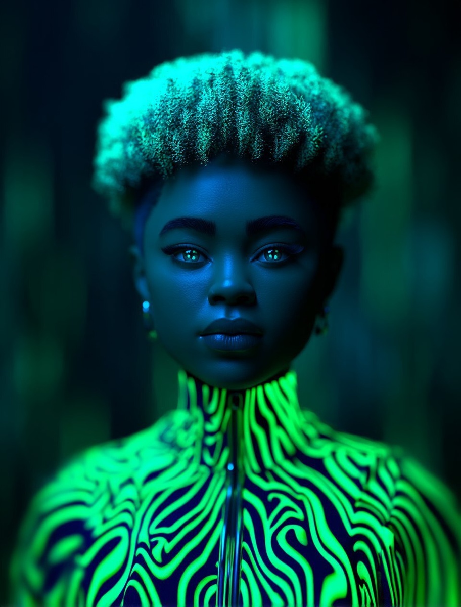 Создано на основе запроса: A beautiful, green-haired female alien in the style of an evil empress. She has black and white fragmented sublime eternal swirls on her skin with glowing silver eyes. She is wearing futuristic attire covered by swirling green energy waves, appearing hyper-realistic. She is facing forward, front and centered --- Автоперевод: Красивая зеленоватая женщина инопланетянин в стиле злой императрицы. Красиво получилось? 🤔 https://dzen.ru/id/65c0c65c86e4f837c27b24d7 #ИИ #AI #нейросеть #midjourney #art