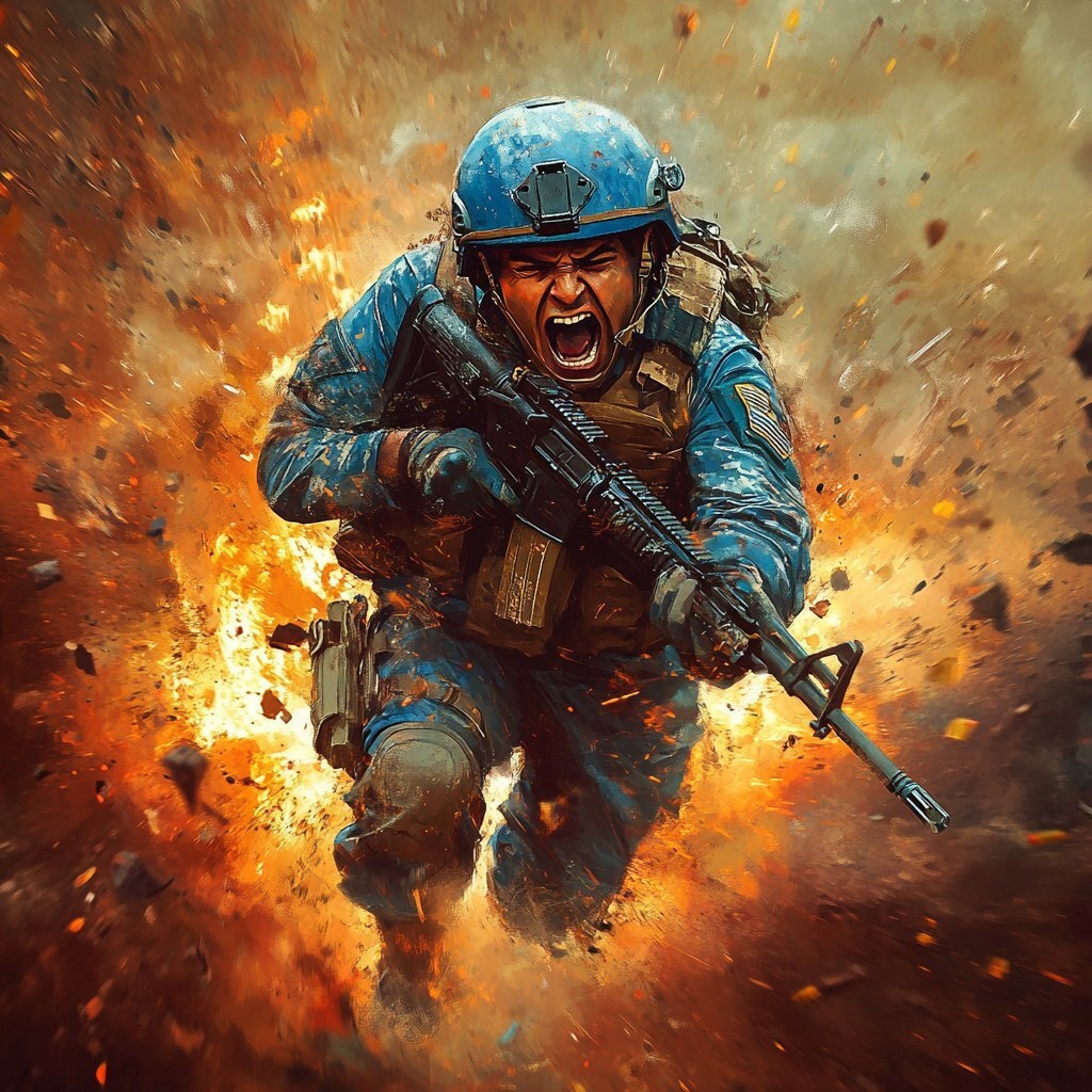 Создано на основе запроса: a dynamic image. a yonung Indian UN peacekeeper wearing uniform and a blue helmet. he has an assault rifle in hand. he is screaming. he is running through an explosion.dirt and debris and amber flying across the frame. night --- Автоперевод: динамичное изображение. Классно получилось? 🤔 https://dzen.ru/id/65c0c65c86e4f837c27b24d7 #ИИ #AI #нейросеть #midjourney #art
