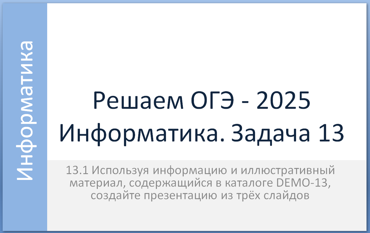 Одна из практических задач ОГЭ - это создание презентации. Рассмотрим, как можно быстро и правильно создать презентацию при выполнении задания 13.1 ОГЭ.