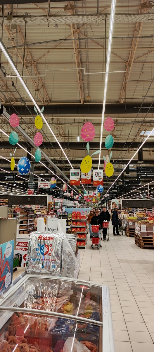 В Ашан вообще не планировалось, но назрели вопросы по мобильной связи, а ближайший офис t2 именно там, так что в Ашан. Ну и вот там уже Пасха во всю!) Вот это ашановское пр-во, есть на все кошельки от ... 30 рублей. Всё можно попробовать... А вот на этом фанерном яичке сверху приколы... Дизайнерские, авторские куличики... И вот такие бланки... Заполняй и забирай))) Естественно уже полно куличей и от всяких хлебозаводов... А вот ТуТ уже покруче, уже Италия... Немецкий кулич в форме ягнёнка... Польские "яйца"... Шоколад французский... Вот этот петух роскошный!))) Такой семисотграмовый леденец на палке!) Естественно декора всякого разного полно. В общем к Пасхе есть всё, практически весь центральный проход забит Пасхой...))) ——————— Меня порадовала моя "Маруся"... Полкило - две сотни. Закуп был достаточно ленивый, холодильник практически под завязку, так что по минимуму расходники... Из не обычного вот такая колбаска, когда то "Охотный ряд" прям сильно уважал, так что эт
