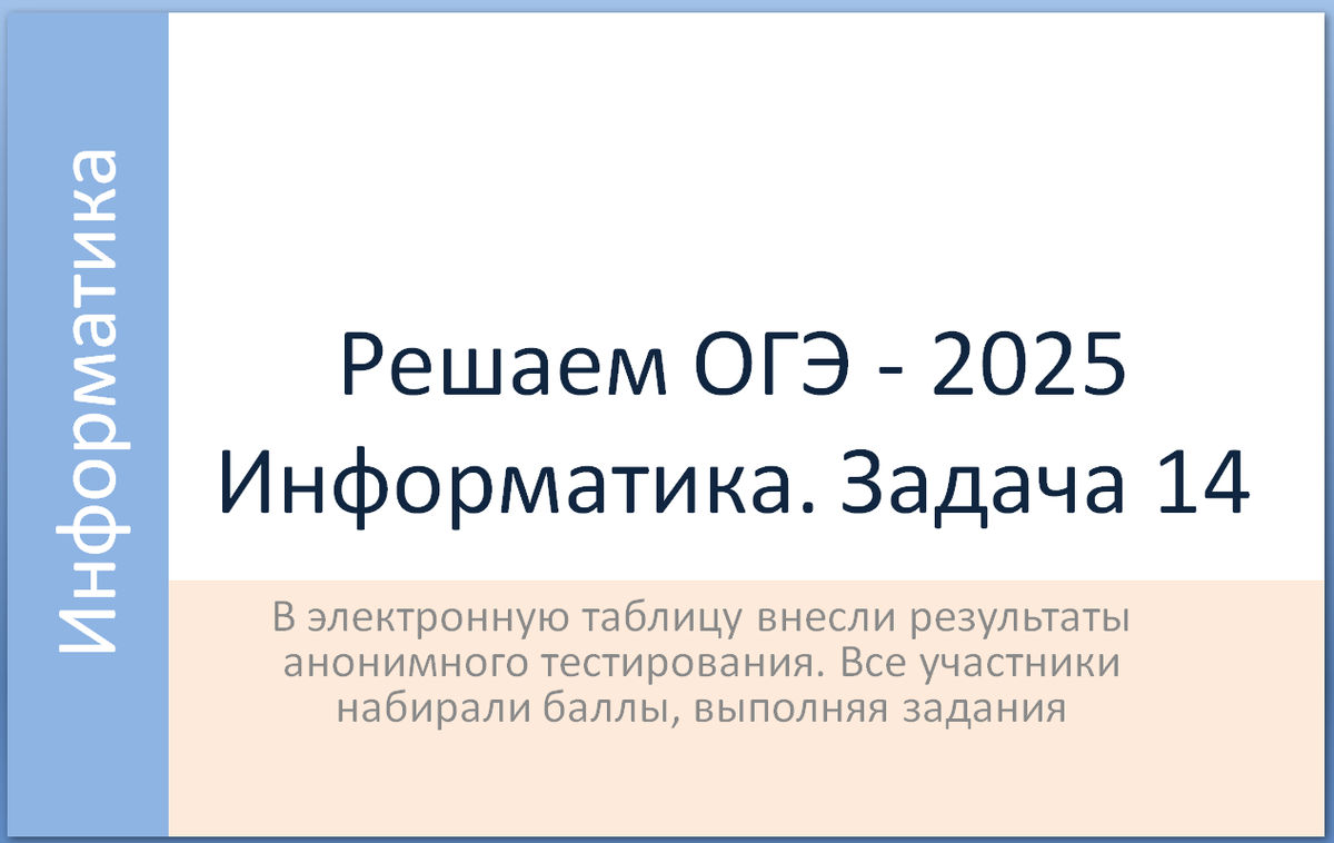 Задача 14 относится к практической части ОГЭ и для ее решения необходим файл с исходными данными. В предлагаемом в качестве демо-варианта 2025 года файле имеются данные о 1000 участниках тестирования.