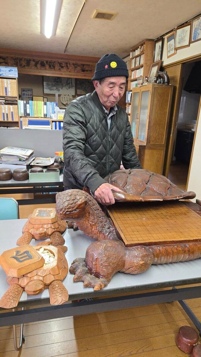 Фотографии из клуба Го в городе Тамба-Сасаяма (Япония). Судя по коллекции, это клуб Го с большой традицией. На фото 1 и 2 гобан в виде черепахи, и чаши в виде черепашек. Фото 3 и 4 редкий сегодня вид искусства - роспись ракушек Хамагури. Представлены сюжеты с Го. Такие же есть в музее Нихон ки-ин. Фото 5 и 6 кружки с Го сюжетами. На фото 7 и 8 резные фигурки. А на последней фотографии хозяева клуба. Это лишь часть их богатой коллекции