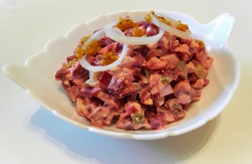 Ещё один салат из моей свекольной коллекции. - 4-6 небольших свёклы - 1 филе куриной грудки (запечённое или копчёное) - 5 куриных яиц - 1 средняя луковица (красная/белая/репчатая) - 4-6 небольших маринованных огурца - Соль - Чёрный перец - Майонез - Зернёная горчица (по желанию) Свёклу отварить или запечь, очистить, порезать кубиками. Куриную грудку (без кожи) посолить, поперчить, натереть мускатным орехом (по желанию), завернуть в фольгу и запечь в духовке до готовности (30-40мин. при 180Ц). Остудить не разворачивая фольгу. Или взять копчёную куриную грудку. Порезать кубиками. Варёные яйца и маринованные огурцы порезать кубиками. Лук так же порезать мелким кубиком и при необходимости замариновать (щепотка соли, сахара и чайная ложка натурального уксуса). У меня лук был сладкий, поэтому я не мариновала. Всё соединить в миске, добавить соль, перец, майонез, зернёную горчицу и перемешать... Дать настояться 1-2часа в холодильнике или 30-60мин. при комнатной температуре. Никогда не варю. В