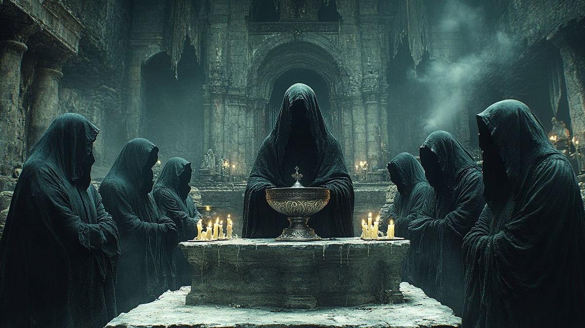 Создано на основе запроса: An ornate silver chalice placed on a stone altar, surrounded by hooded figures in black robes, eerie candlelight