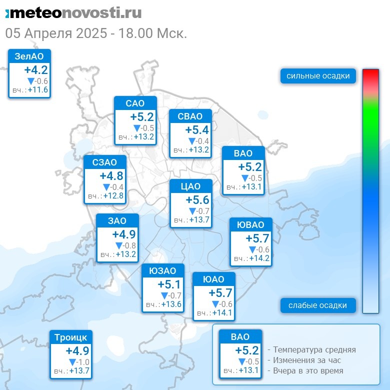 В 18:00 в Москве было от +4°C до +5.8°C, средняя температура +5.2°C #погода #Москва #весна #температура #5апреля #суббота