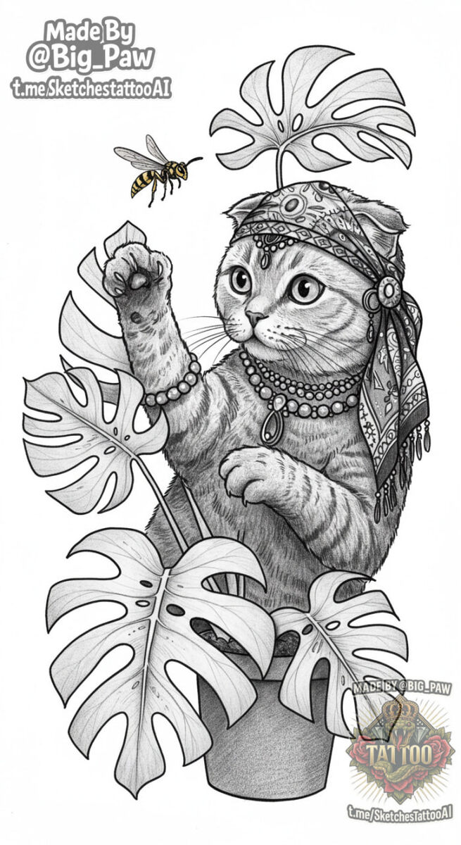 #2207 Подборка по запросу подписчика - можно эскиз кот шотландский серый в цыганском костюме, охотится за осой, которая улетает на монстеру. 🧠 SYNTX 💳 Донат 😎 НейроБро 💀 Эскизы от нейросети #кот #оса #монстера #эскизы #тату #татуировки