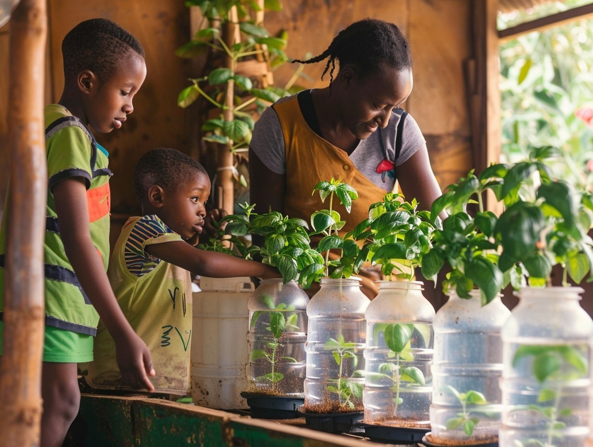 Создано на основе запроса: Realistic indoor microfarm scene in Africa homemade hydroponic system using cut plastic bottles, basil or mint growing in nutrient-rich water. A curious African child and adult experiment together, surrounded by reused containers, natural light coming through a simple window. Another angle: an outdoor agroforestry plot with mixed trees and crops in dynamic succession planting. Subtle aquaponic setup with a small fish tank and vertical plants. Clean, functional, low-tech but innovative. Warm natural lighting, practical realism, educational atmosphere. --- Автоперевод: Реалистичная внутренняя сцена микрофарденозаписи в Африке домашняя гидропонная система с использованием бутылок с разрезами, базилика или мяты, выращивая в богатой питательными веществами воды. Интересно выглядит? 🤔 https://dzen.ru/id/65c0c65c86e4f837c27b24d7 #ИИ #AI #нейросеть #midjourney #art