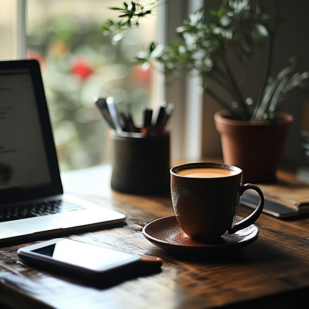 Создано на основе запроса: [Start-of-day rituals, coffee and quiet workspace], photorealistic, Canon EOS 6D style, mindful beginnings