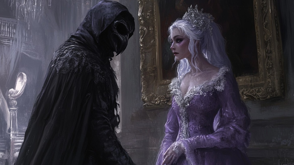 Создано на основе запроса: A painting scene of a dark-hoodede figure with a black crow mask stood right next to a lavender-haired mature