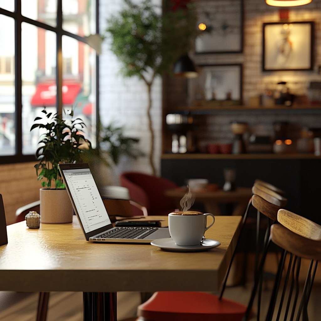 Создано на основе запроса: [Cozy cafe workspace, coffee and laptops], photorealistic, Panasonic Lumix GH5 style, ambient creativity, caffeine-fueled productivity.