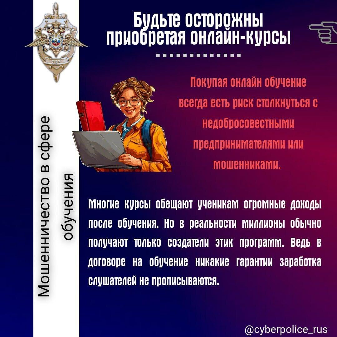 Обещают быстро обучить зарабатывать на бирже, стабильный и высокий доход, получить профессию мечты ? ⚠️В карточках подробно о том как избежать встречи с мошенниками и недобросовестными предпринимателями при покупке онлайн-обучения. Изучите и поделитесь с близкими! #НетМошенникам #безопасность Источник: Полиция Кубани (https://t.me/mvd_23)
