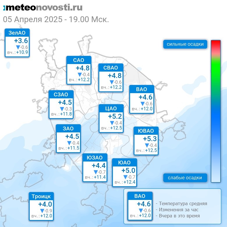 В 19:00 в Москве было от +3.4°C до +5.4°C, средняя температура +4.7°C #погода #Москва #весна #температура #5апреля #суббота