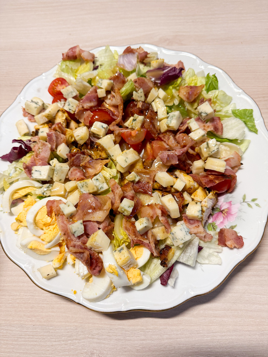 От мамы Салатные листья Куриная грудка Яйца Черри Бекон Сыр с плесенью Для заправки: Подсолнечное масло 8стл Горчица обычная горькая 2чл Мед 2стл Винный уксус 2 стл ✅ Куриную грудку обжарить ✅ Бекон обжарить ✅ Яйца отварить Все соединить с салатными листьями, черри, сыром и заправить заправкой Вкусно ♥️