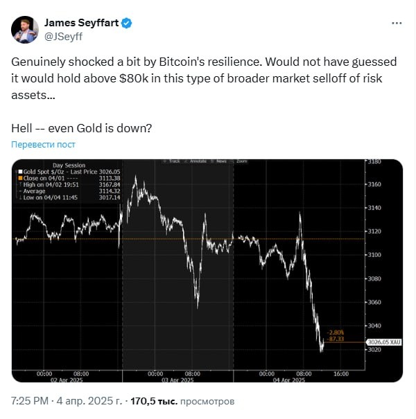 Искренне удивлен устойчивостью биткоина. Не ожидал, что он удержится выше $80 тыс. на фоне массовой распродажи рисковых активов... Ад — даже золото падает?