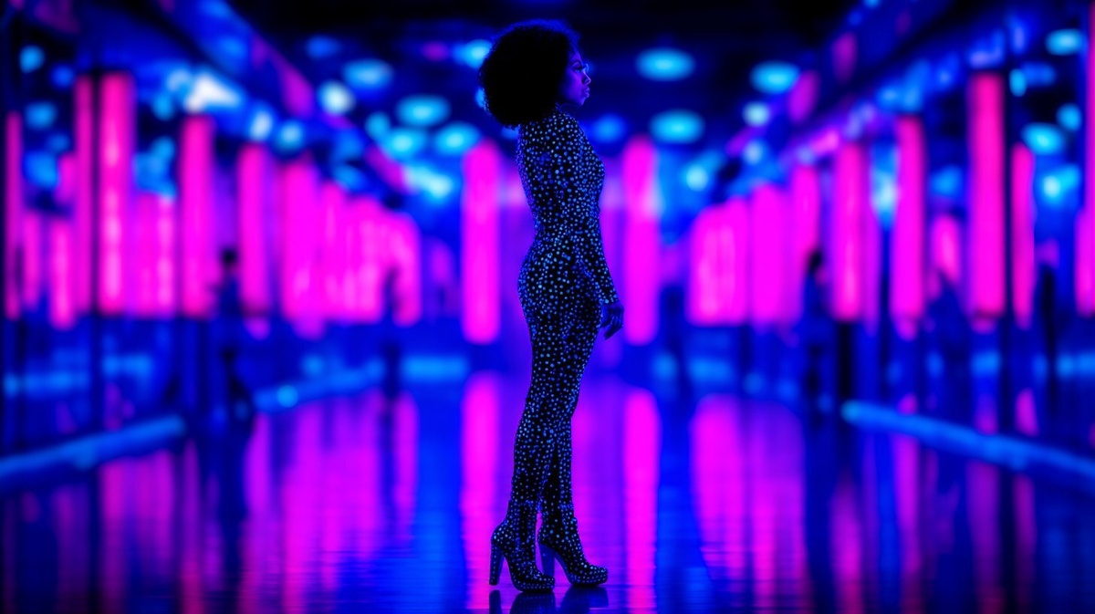 Создано на основе запроса: A mysterious disco diva in a fully mirrored bodysuit stands motionless in the center of the spinning dance floor