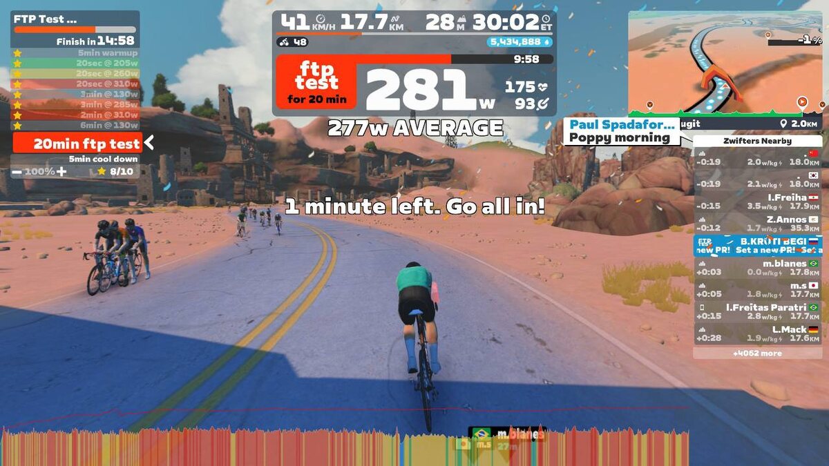 Чё по FTP? Да ничего особенного. Ну как минимум вернул форму после перерыва. Тоже хорошо. Вчера вместо интервальной тренировки решил сделать ftp тест. Состояние средне-будничное.. Сел и погнал. Короткий тест мне не нравится, на нём я не успеваю нормально размяться. Поэтому всегда выбираю стандартный на 45 минут. Первая интервальная часть зашла нормально. Первые 5 минут шли прилично. Вторые 5 минут начал проседать. Третьи 5 минут то чуть сильнее, то чуть слабее.. начал наедаться. Четвёртые 5 минут были уже рваными, начал вставать на ноги и выдавливать остатки. Под конец ускорился и добрал несколько ватт. 20и минутный отрезок получился 280ватт и ftp зафиксировало на отметке 267ватт. Расчитывал я конечно выдавить больше, но пока ещё слабоват. Кстати отдельно хочу сказать как удобно делать этот тест в Zwift. Если помните в прошлый раз я делал его в приложении Tacx и возмущался тем что EGR режим блокировал возможность добавлять ногами. Приходилось вручную все время регулировать по ход