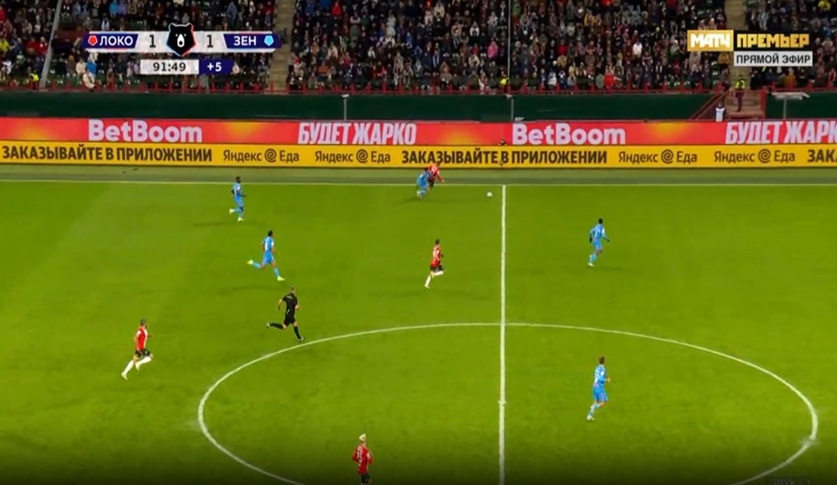 Правильное решение принимает Чистяков и показывает 2-ю ж.к игроку №24 команды Зенит за СПА.