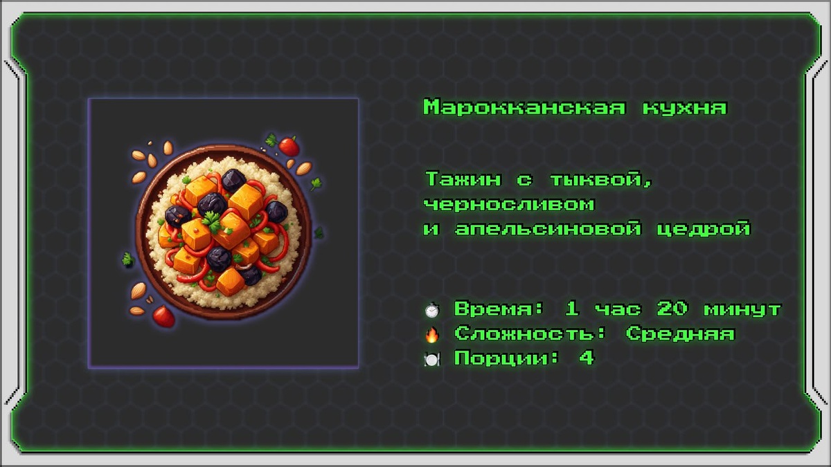Марокканский Ужин Тажин с тыквой, черносливом и апельсиновой цедрой Этот рецепт представляет собой креативную интерпретацию традиционного марокканского блюда — тажина. Сладкая тыква сочетается с черносливом и ароматной апельсиновой цедрой, что создаёт уникальный баланс сладких и пряных вкусов. Блюдо подаётся с хрустящим кускусом, делая его идеальным для сытного ужина. Информация о рецепте: ⏱️ Время: 1 час 20 минут 🔥 Сложность: Средняя 🍽 Порции: 4 Ингредиенты: Для тажина: • 🎃 Тыква (нарезанная крупными кусками) — 400 г • 🍑 Чернослив (без косточек) — 100 г • 🌶 Красный болгарский перец (нарезанный полосками) — 1 штука • 🧄 Чеснок (измельчённый) — 3 зубчика • 🍋 Апельсиновая цедра (натёртая) — 1 чайная ложка • 🌿 Корица молотая — ½ чайной ложки • 🌿 Куркума молотая — ½ чайной ложки • 🫒 Оливковое масло — 3 столовые ложки • 💧 Вода или овощной бульон — 300 мл • 🧂 Соль — по вкусу • 🌶 Молотый чёрный перец — по вкусу Для кускуса: • 🍚 Кускус (мелкий) — 200 г • 💧 Вода или бульо