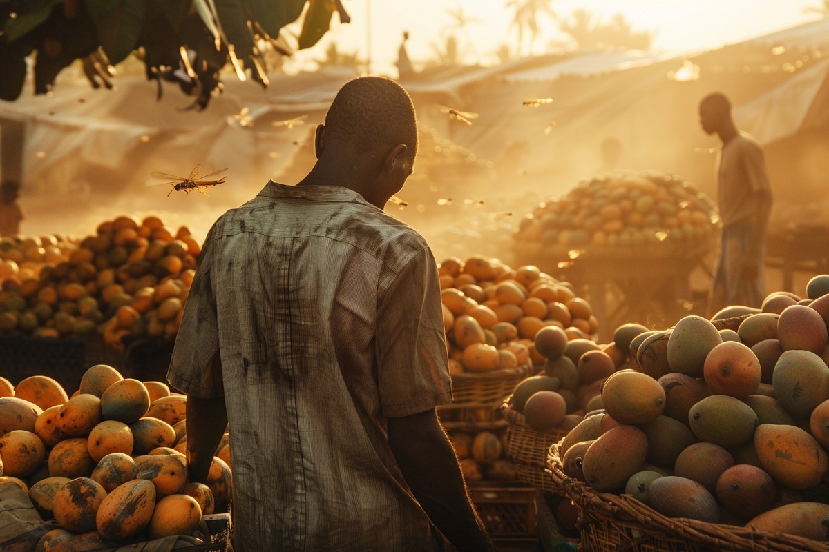 Создано на основе запроса: Photorealistic scene, rural West Africa dozens of overripe mangos piled in woven baskets, starting to rot under the sun. Flies circle, shadows stretch. A young African man (Moussa) stands nearby, visibly frustrated, his shirt soaked in sweat. Dust in the air. The atmosphere feels heavy with waste and missed opportunity. Golden afternoon light, earthy colors, cinematic documentary style. --- Автоперевод: Фотореалистическая сцена, сельская Западная Африка десятки перезрелых манго, сложенных в тканых корзинах, начинающих гнить под солнцем. Необычно получилось? 🤔 https://dzen.ru/id/65c0c65c86e4f837c27b24d7 #ИИ #AI #нейросеть #midjourney #art