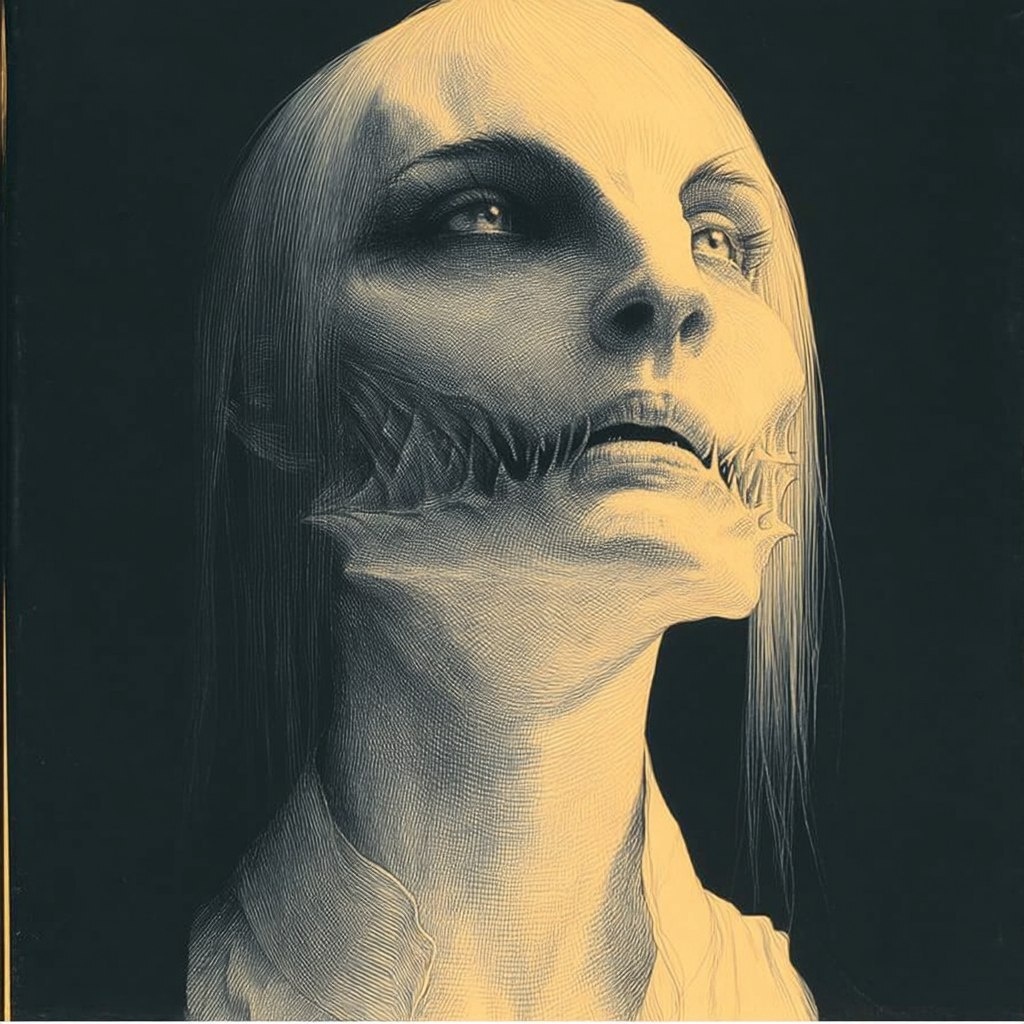 Создано на основе запроса: cosmic horror creature, distorted angular black and white cosmic horror etching, liminal horror, old minimal