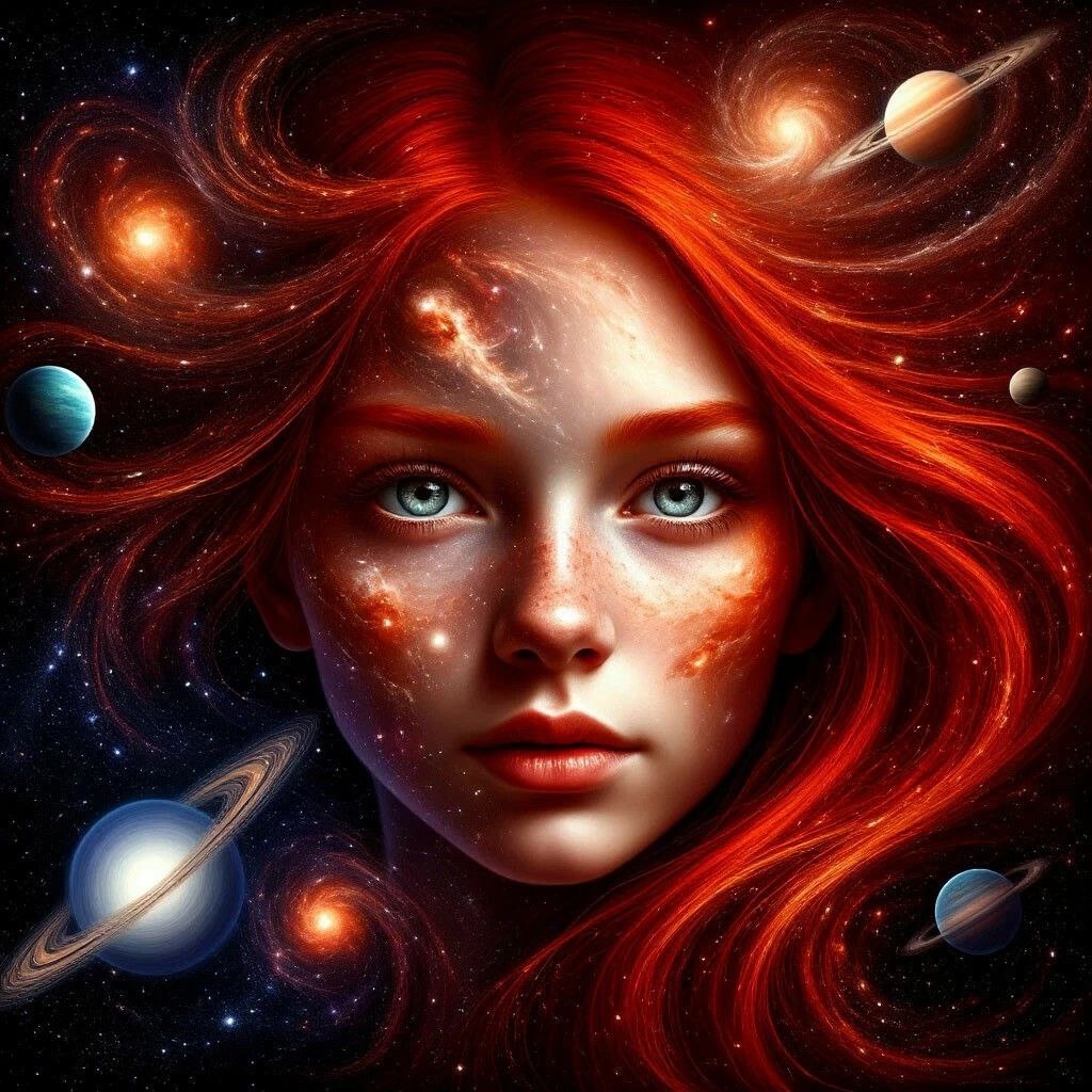 Рыжие волосы девушки напоминают звездное небо, а плавные переходы цветов создают впечатление, что она находится в движении, словно планеты вращаются вокруг нее.
